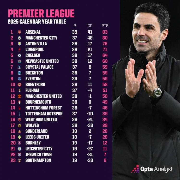 24直播网北京时间1月1日消息,2025年已经结束,Opta统计了2025年英超积分排行榜以及净胜球情况,阿森纳以83分位居榜首。目前,阿森纳多赛一场以5分优势领跑2025-26赛季积分榜。2025...