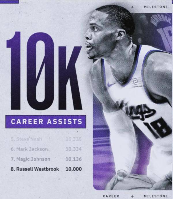 24直播网 在国王队对阵森林狼队的比赛中,37岁的拉塞尔·威斯布鲁克迎来了职业生涯的一个重要里程碑。他在比赛中表现出色,全场贡献了13分、14助攻和10篮板的三双数据,同时职业...