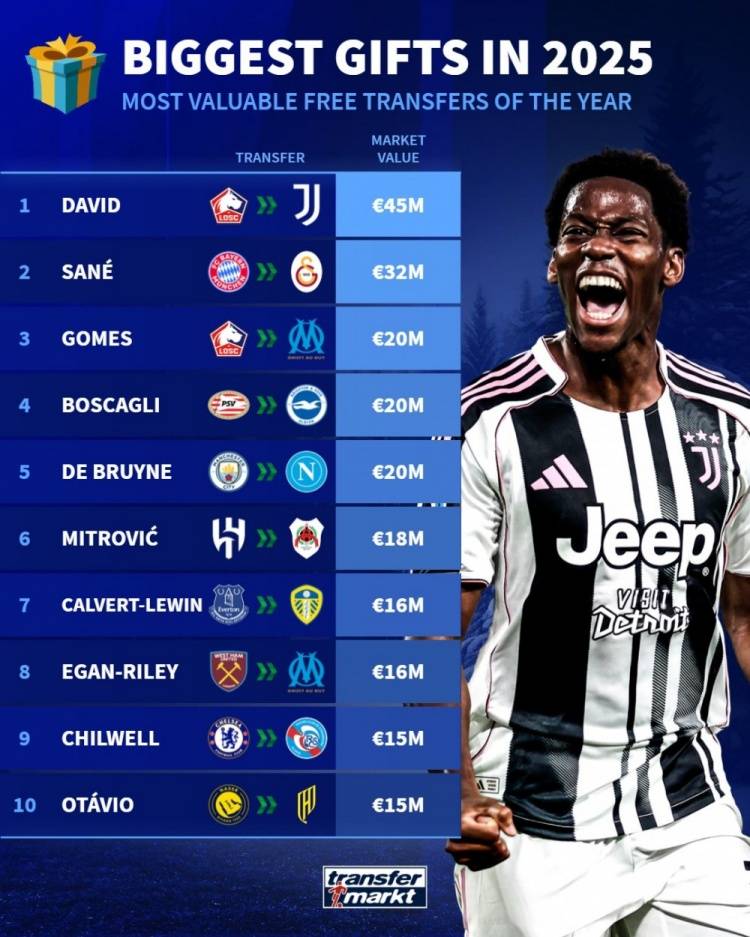 2025年自由转会球员身价:乔纳森·戴维排名第一 德布劳内第三